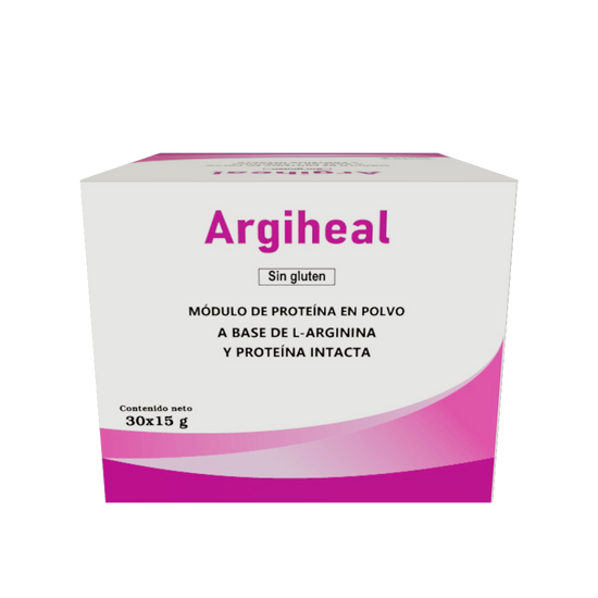 Argiheal es un módulo de proteína en polvo diseñado como soporte nutricional en la cicatrización y tratamiento de heridas. Su combinación de L-arginina (4.5 g) y proteína de suero de alta calidad (5 g) aporta los nutrientes esenciales que estimulan la formación de colágeno, mejoran la circulación sanguínea y contribuyen a la preservación de la masa muscular.